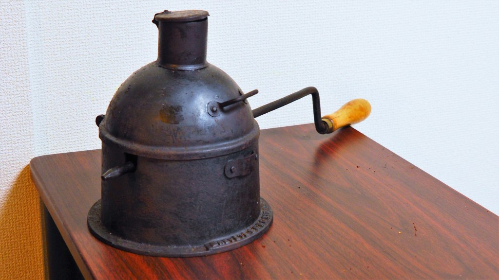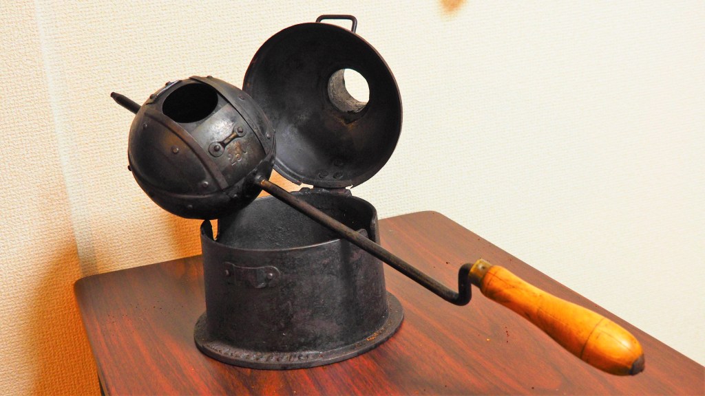 19世紀のフランスで使われていた手回し焙煎機で、他のものも焙煎できた模様ですが主にコーヒー豆に使用されていました。